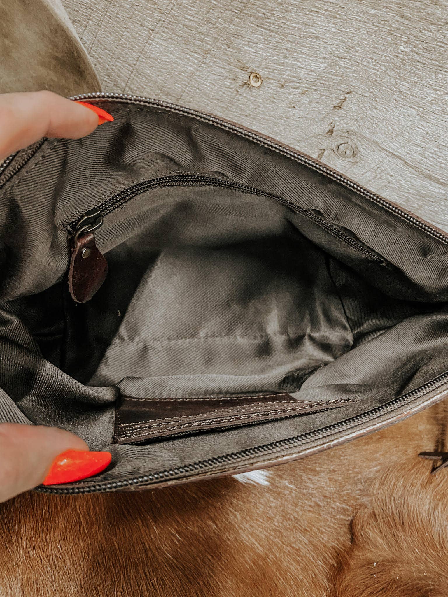 This is a versatile accessory that can be used as a wristlet for your everyday essentials or as a chic toiletry bag for your travels. Made with high-quality leather and a unique tooled front, it also features a convenient inside zipper pocket and a detachable wristlet for ultimate flexibility. It measures 11 1/2 inches by 6 inches by 4 inches.