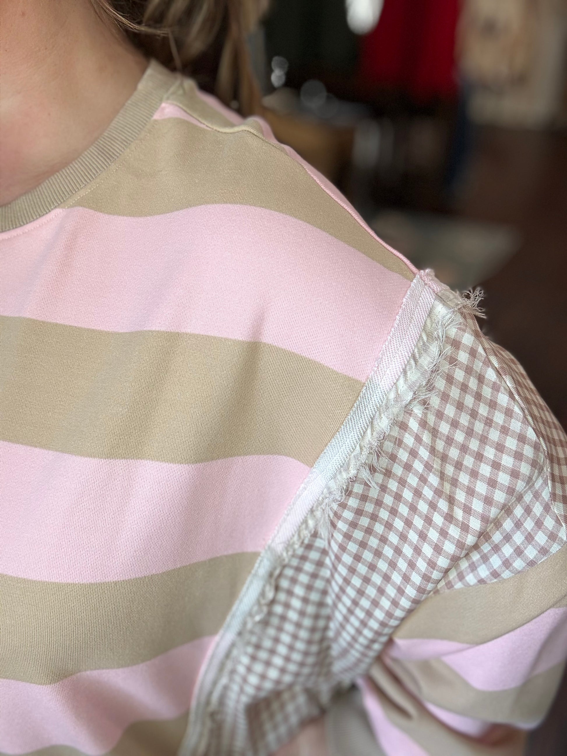 A store favorite! This top is lightweight and oversized. Features a light pink/tan stripe, mixed with a tan/cream gingham pattern. The oversized fit makes it perfect for wearing with leggings or denim.