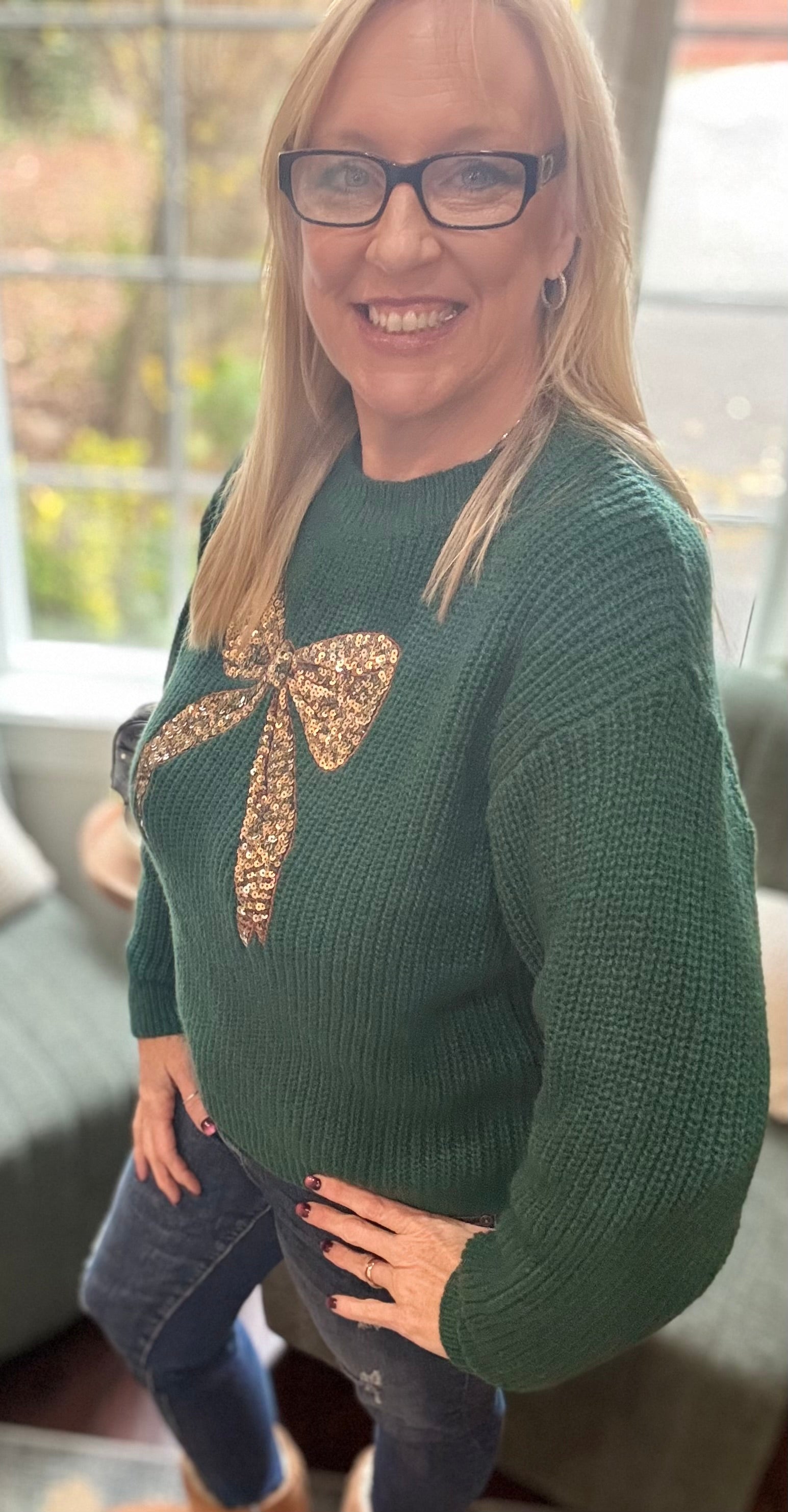 Add a little sparkle to your cozy season. This deep evergreen knit brings instant holiday cheer with its oversized gold sequin bow- playful, chic, and oh-so festive!