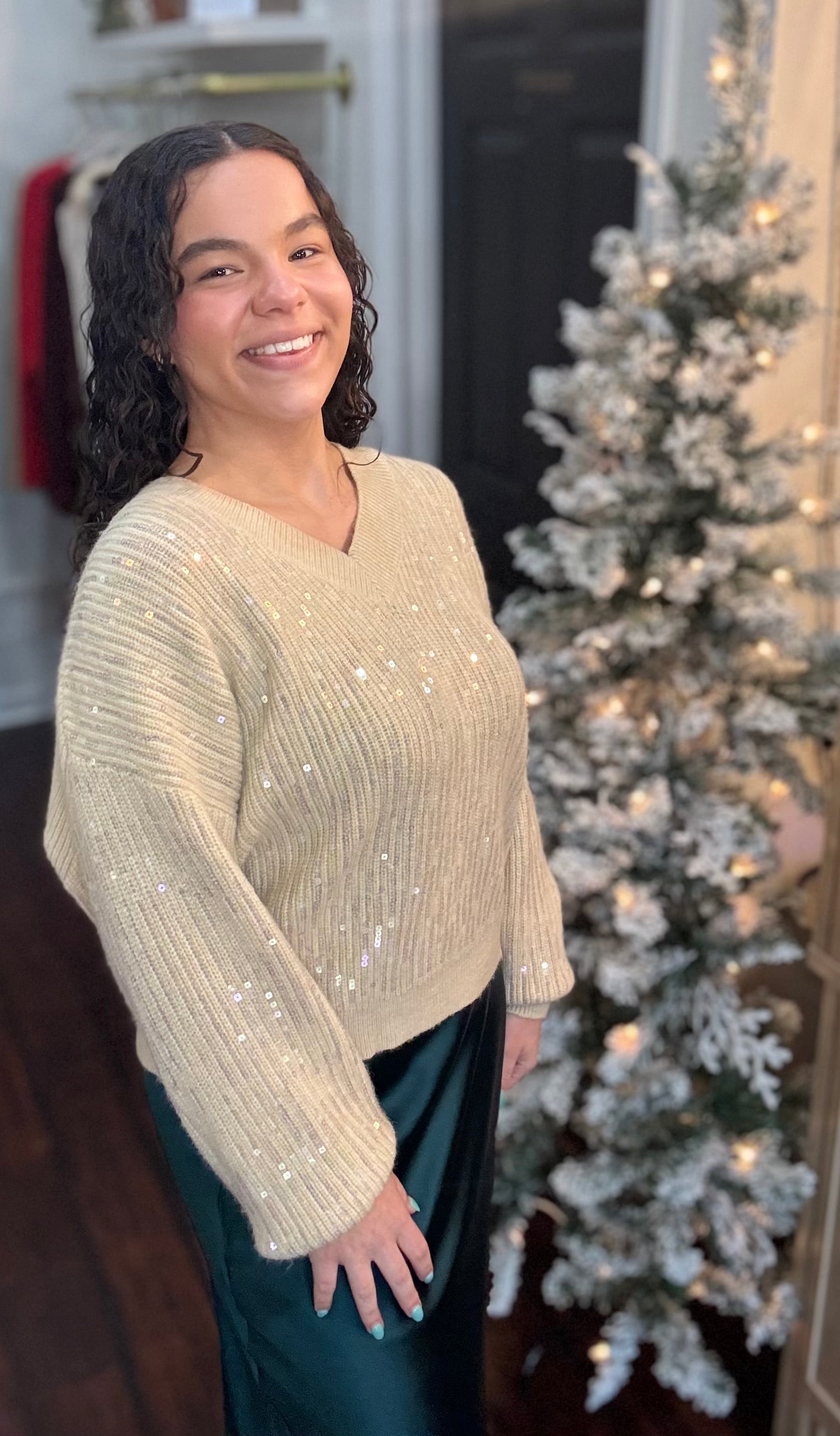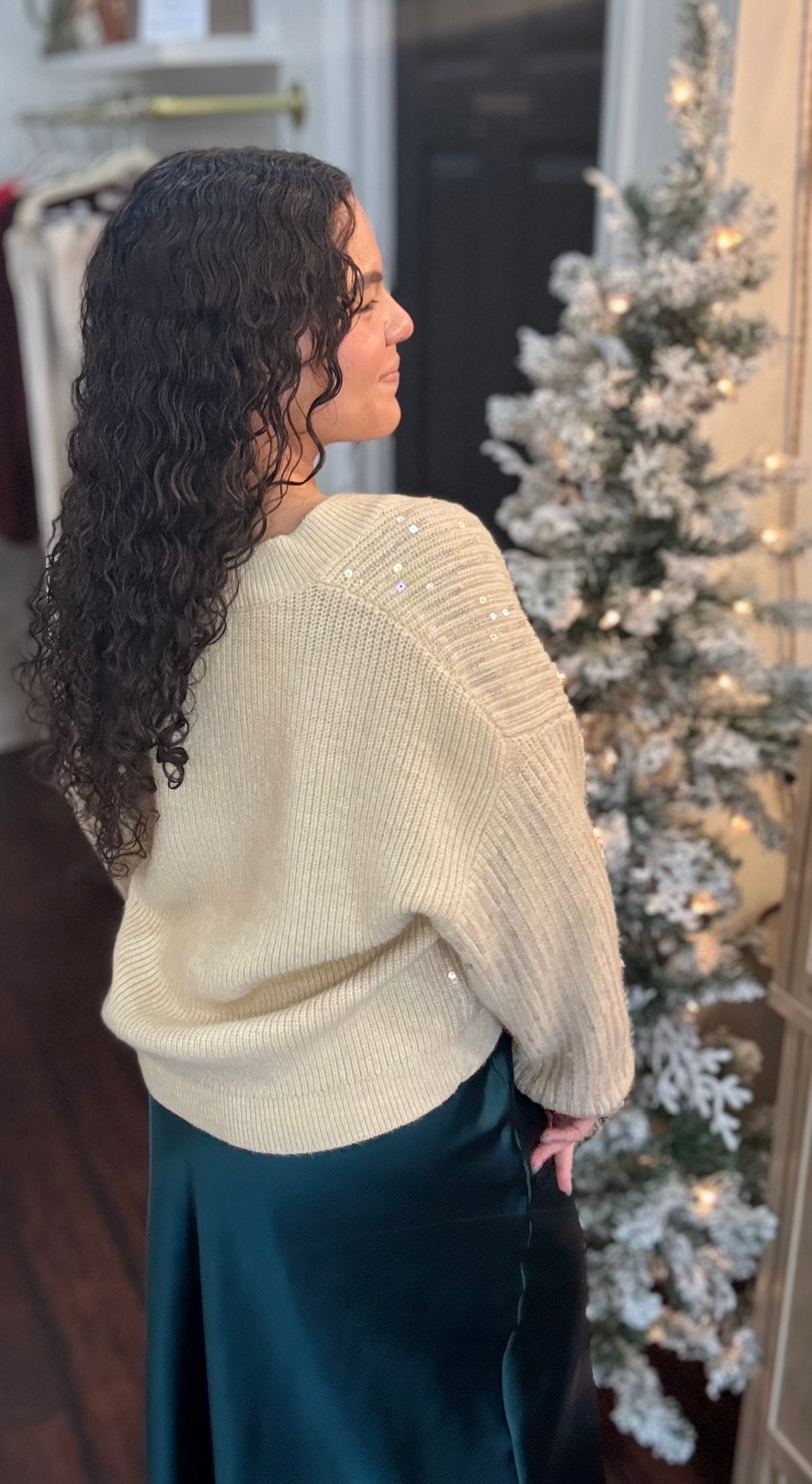 A softly shimmering holiday knit, this champagne-tone sweater features light-catching sequins, relaxed sleeves, and a cozy ribbed texture-perfect for effortless festive sparkle.