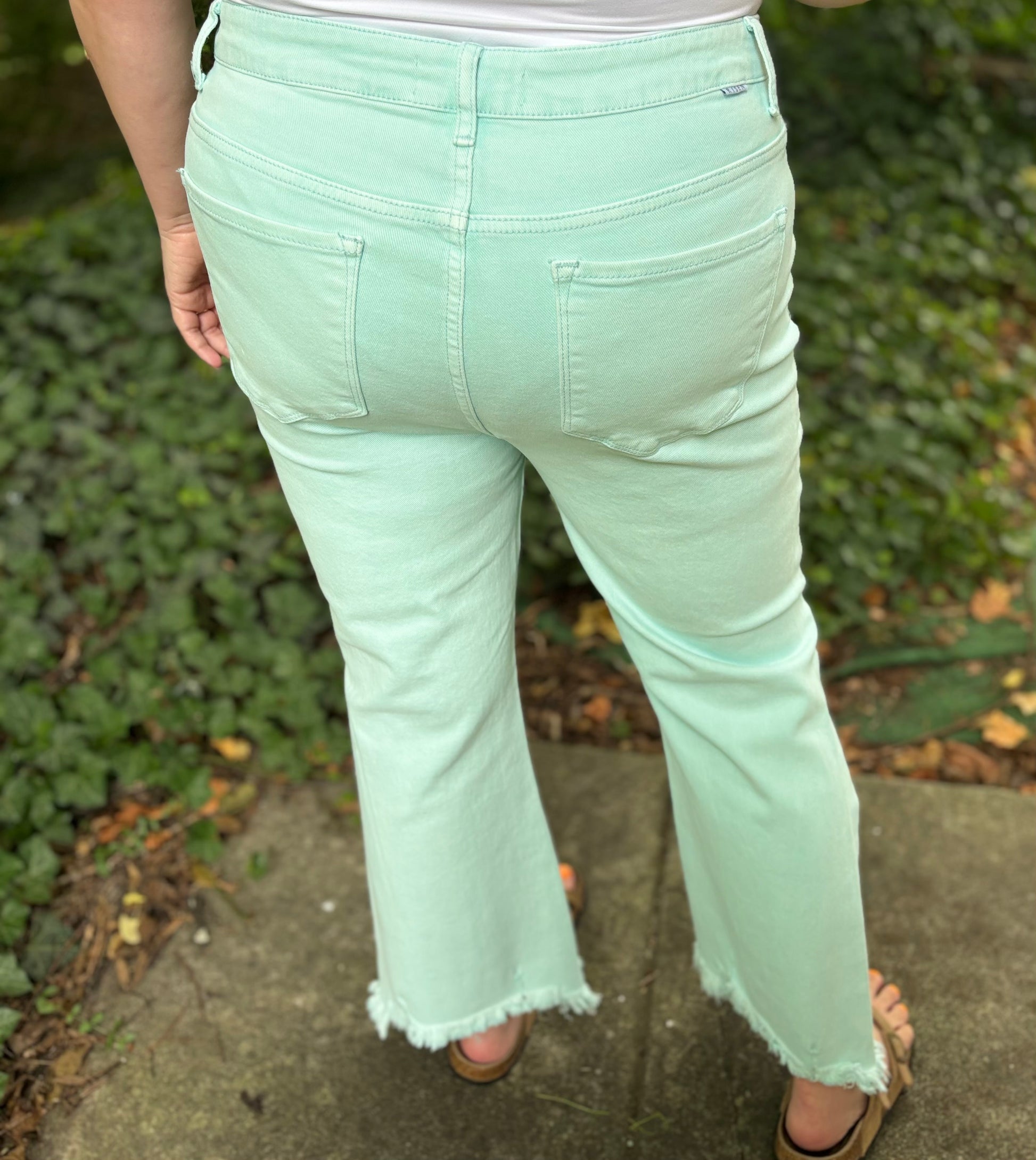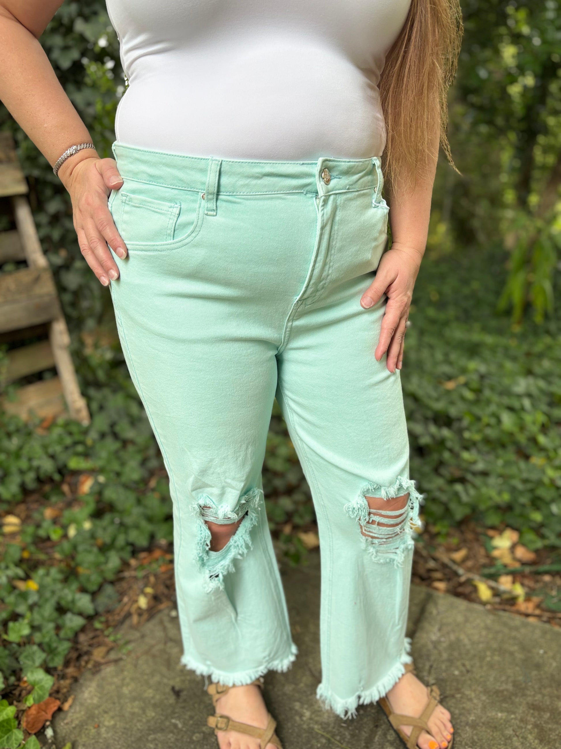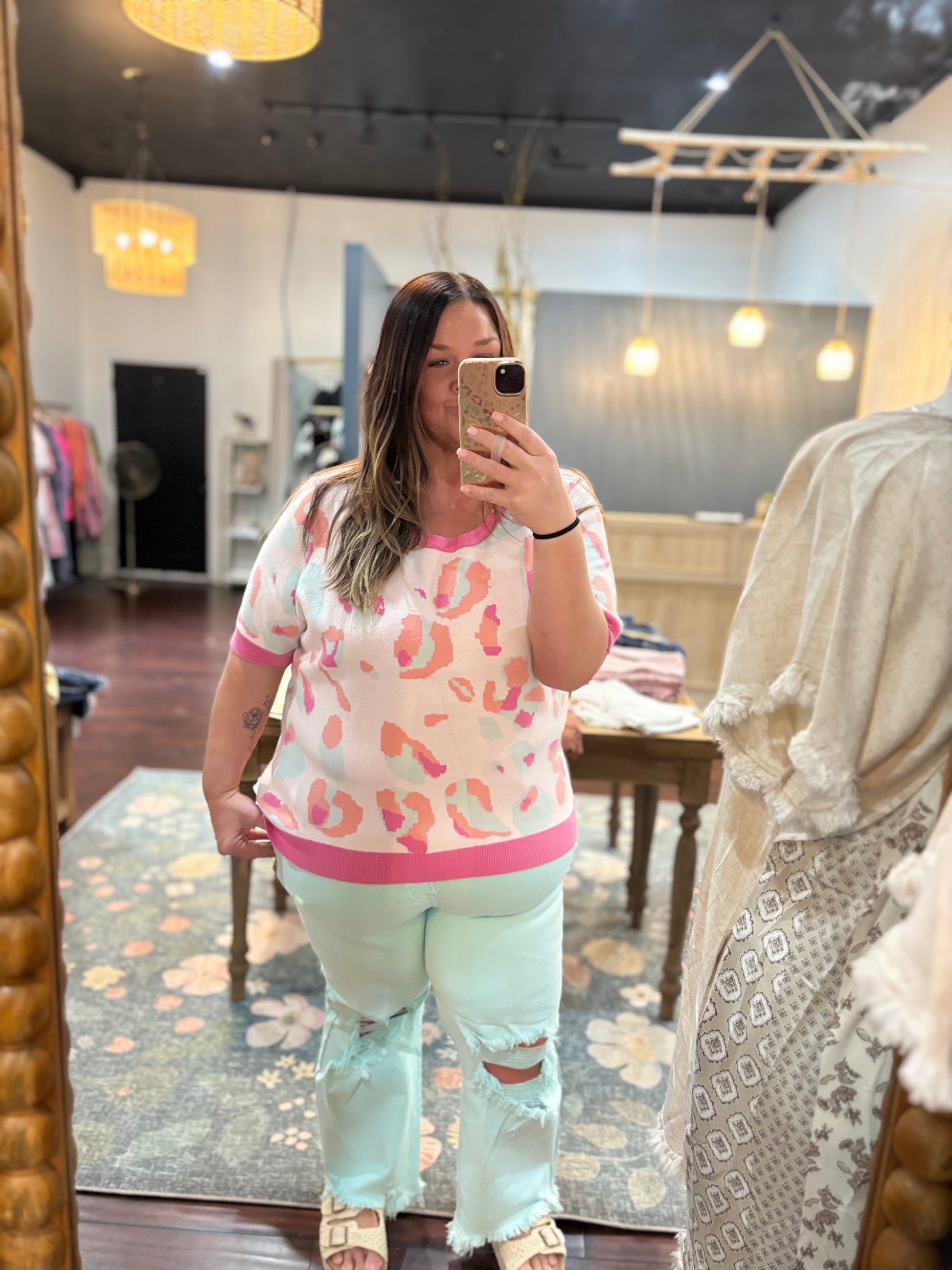 We LOVE this High-Rise Distressed knee jean! It is a summer favorite and paired with our "Sorbet Leopard Top"- Available in 1X-3X