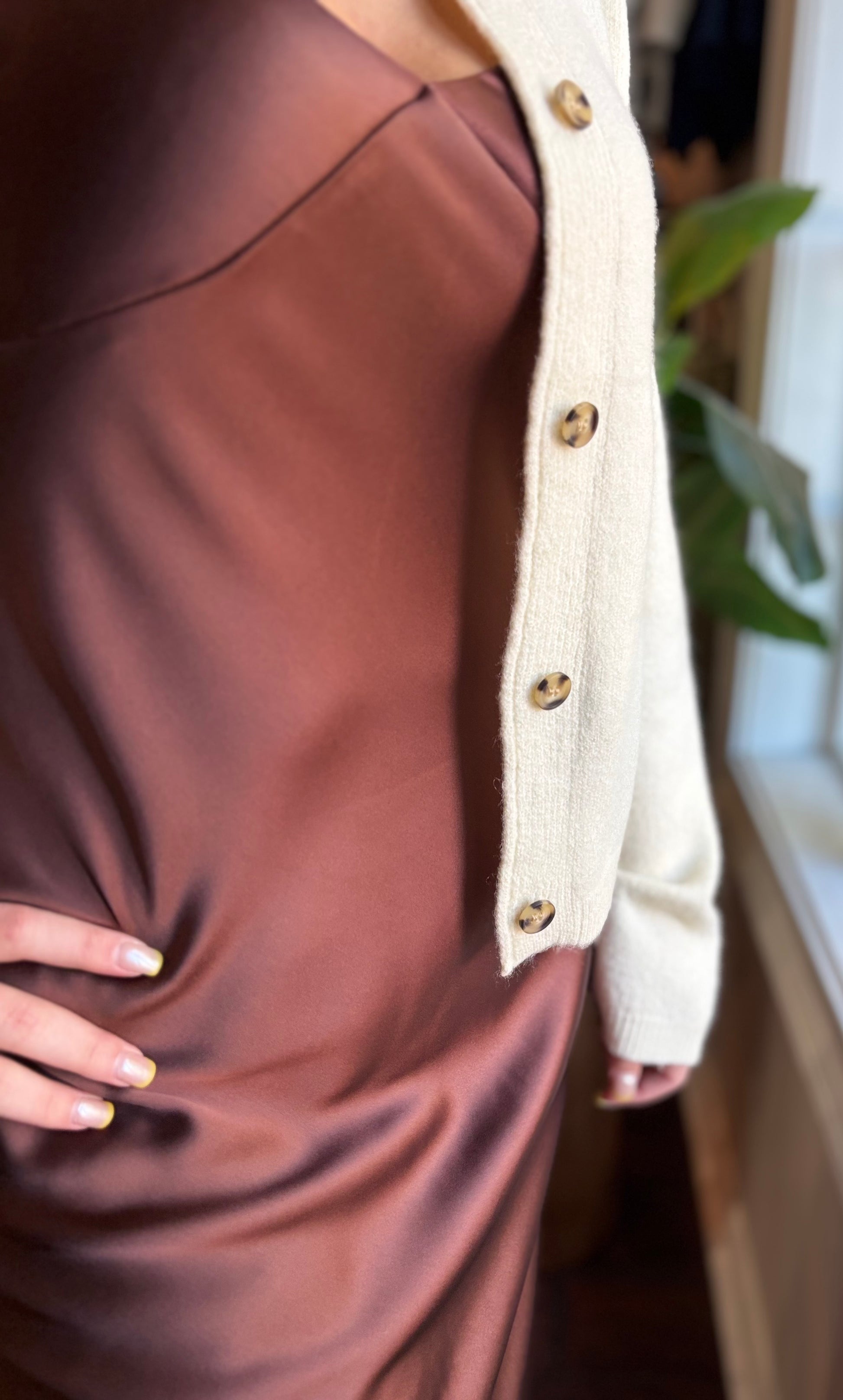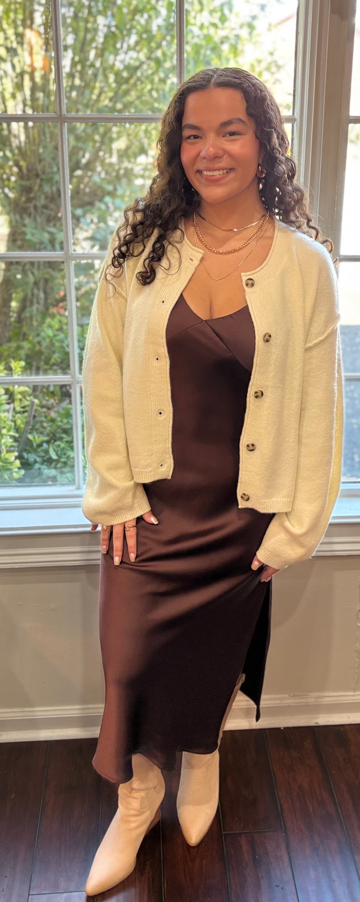This look is effortlessly elegant with a touch of cozy charm- the perfect blend of elevated and approachable. The button-down front adds a relaxed, cozy layer. Paired with our Wanderlust Satin Dress, this is the perfect attire for your holiday plans with family & friends.