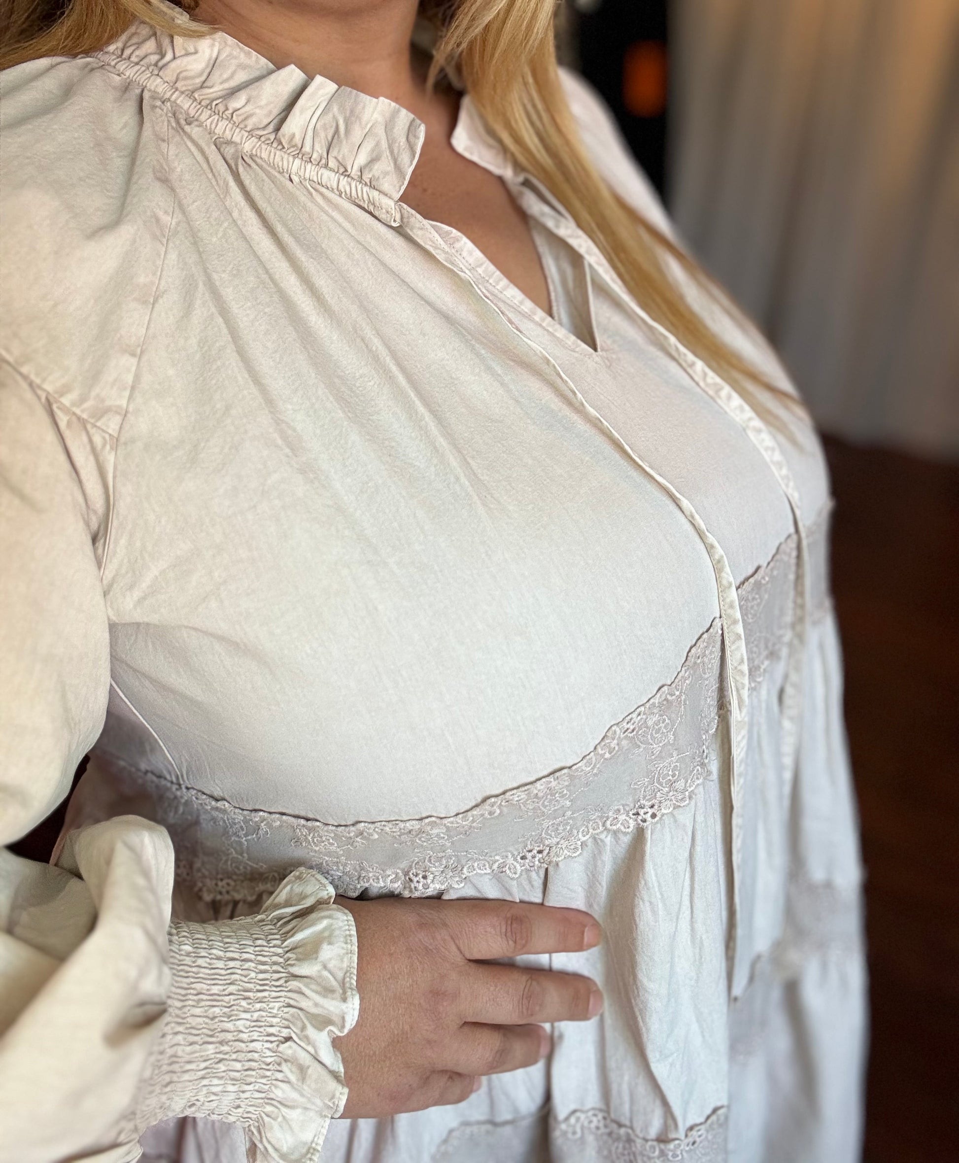 The Golden Ember Dress glows with effortless boho charm, like the last warm light of an autumn sunset. The romantic silhouette features delicate lace accents and subtle rustic details, giving it a timeless prairie-meets-boho-feel.