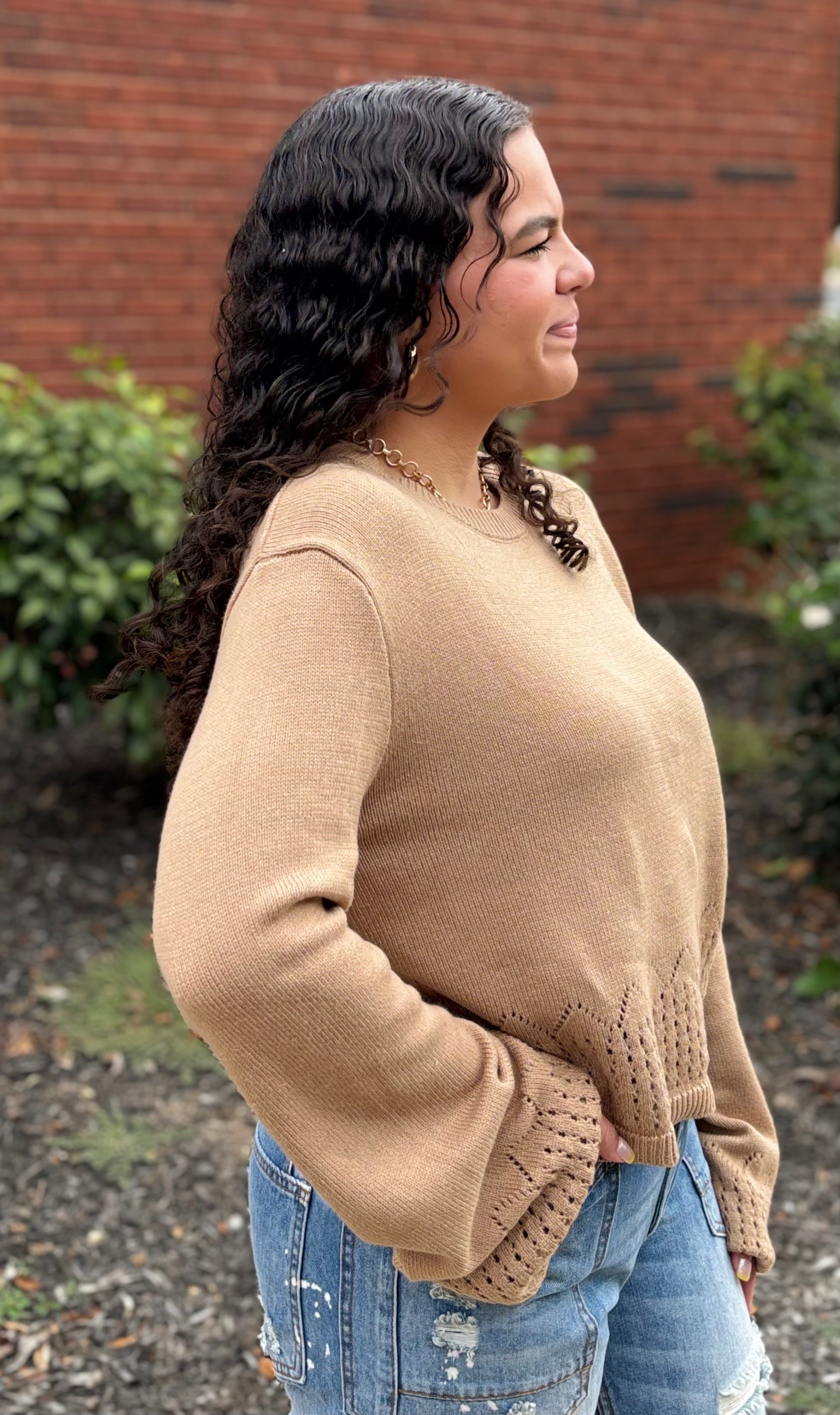 Wrap yourself in rustic charm with the Honey Creek Sweater. Crafted in a warm caramel hue, this knit features wide sleeves with delicate open-stich details to add just the right touch of charm.