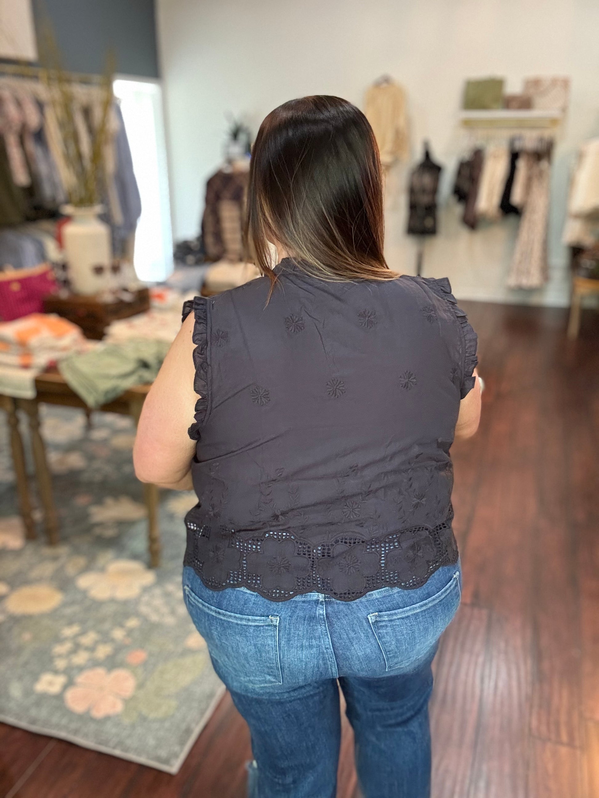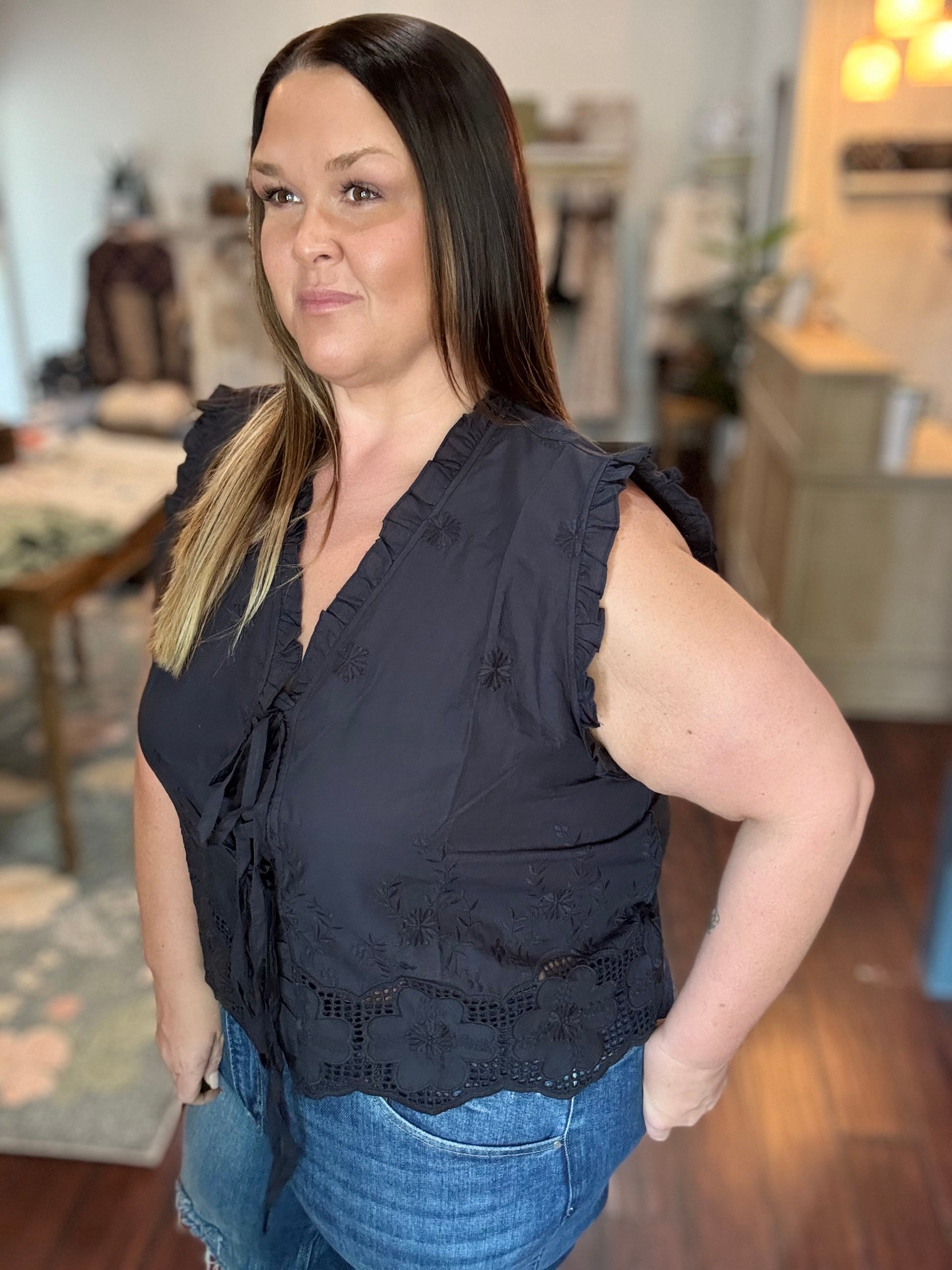 This top is a romantic western inspired blouse with a moody elevated look. Featuring delicate ruffled tiers along the bodice and sleeves, adding a soft, feminine touch that feels like a prairie style with a modern twist. Ties in front.