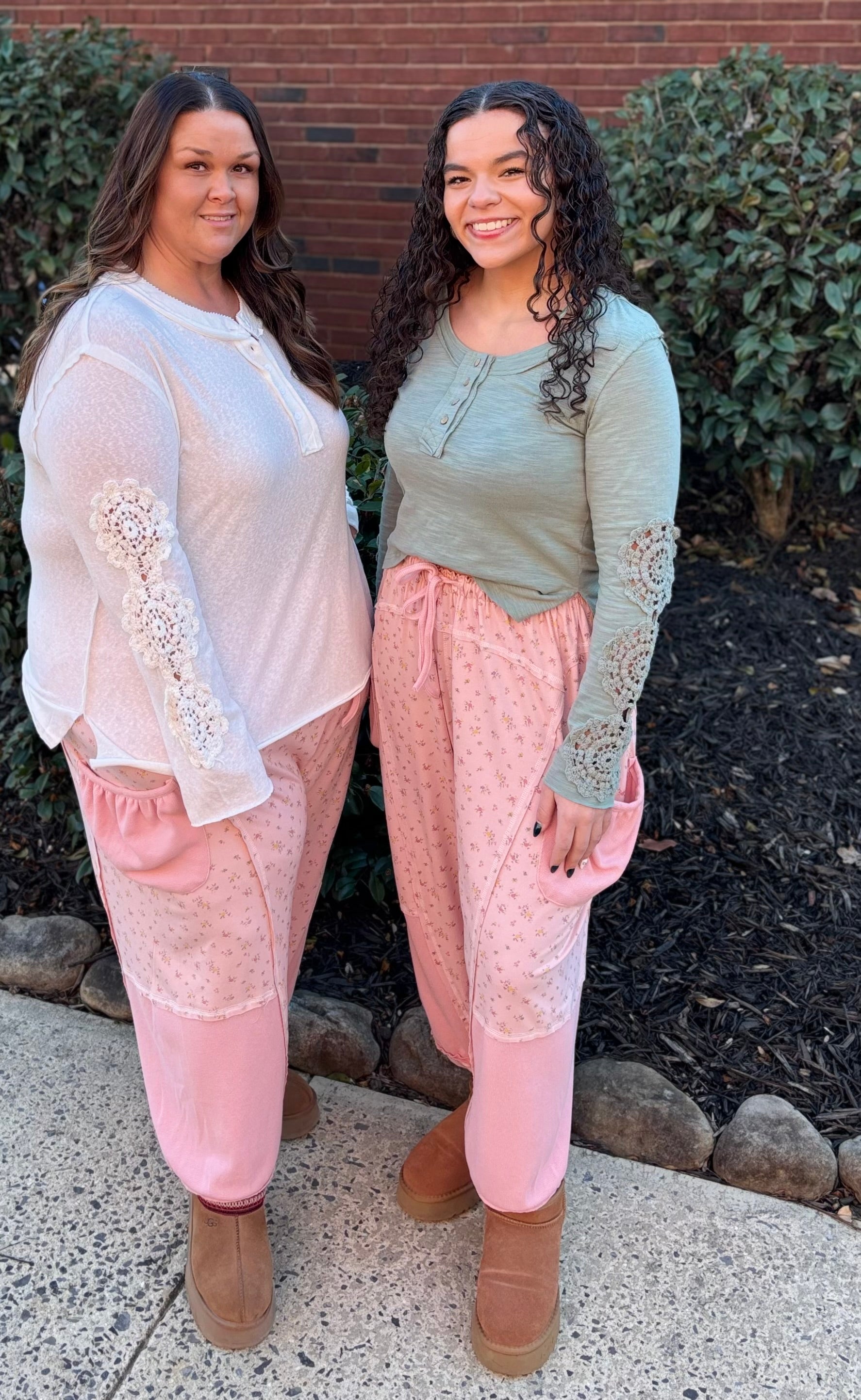 The Rosè Daydream Jogger is the perfect blend of soft romance and everyday comfort. Designed in a muted rosé hue with a delicate allover floral print, this jogger features a relaxed, slouchy fit that feels effortlessly lived-in. Contrast ribbed panels add subtle texture and a touch of boho edge, while the elastic waistband with adjustable drawstring keeps the fit comfy and flattering. Finished with gathered cuffs for an easy jogger silhouette, these pants are made for lounging, errands, and dreamy off-duty days alike.