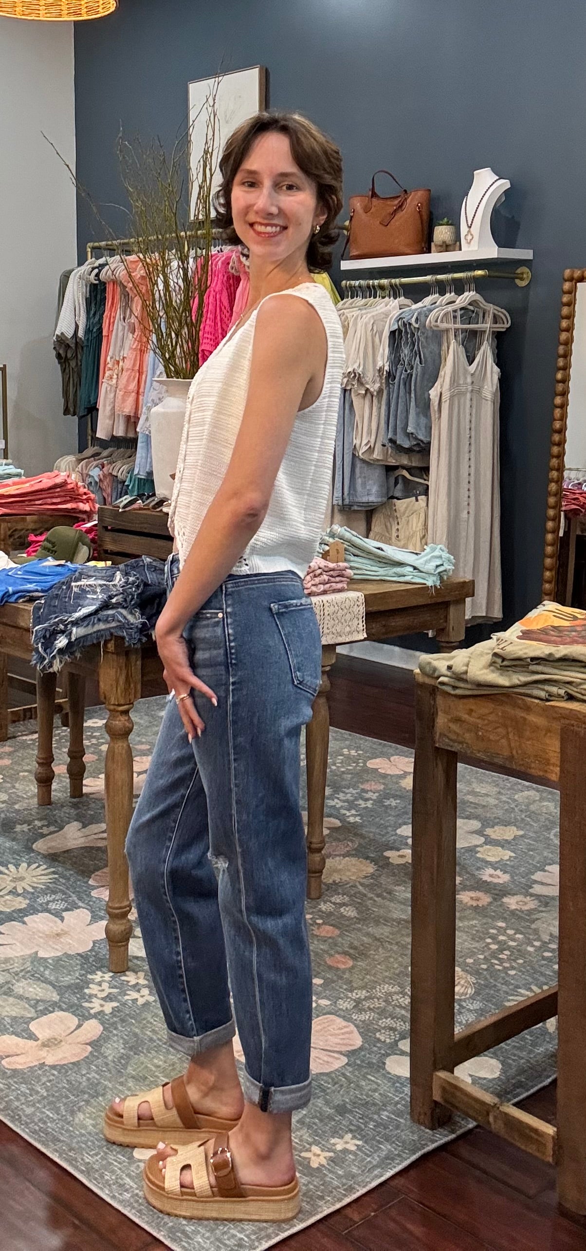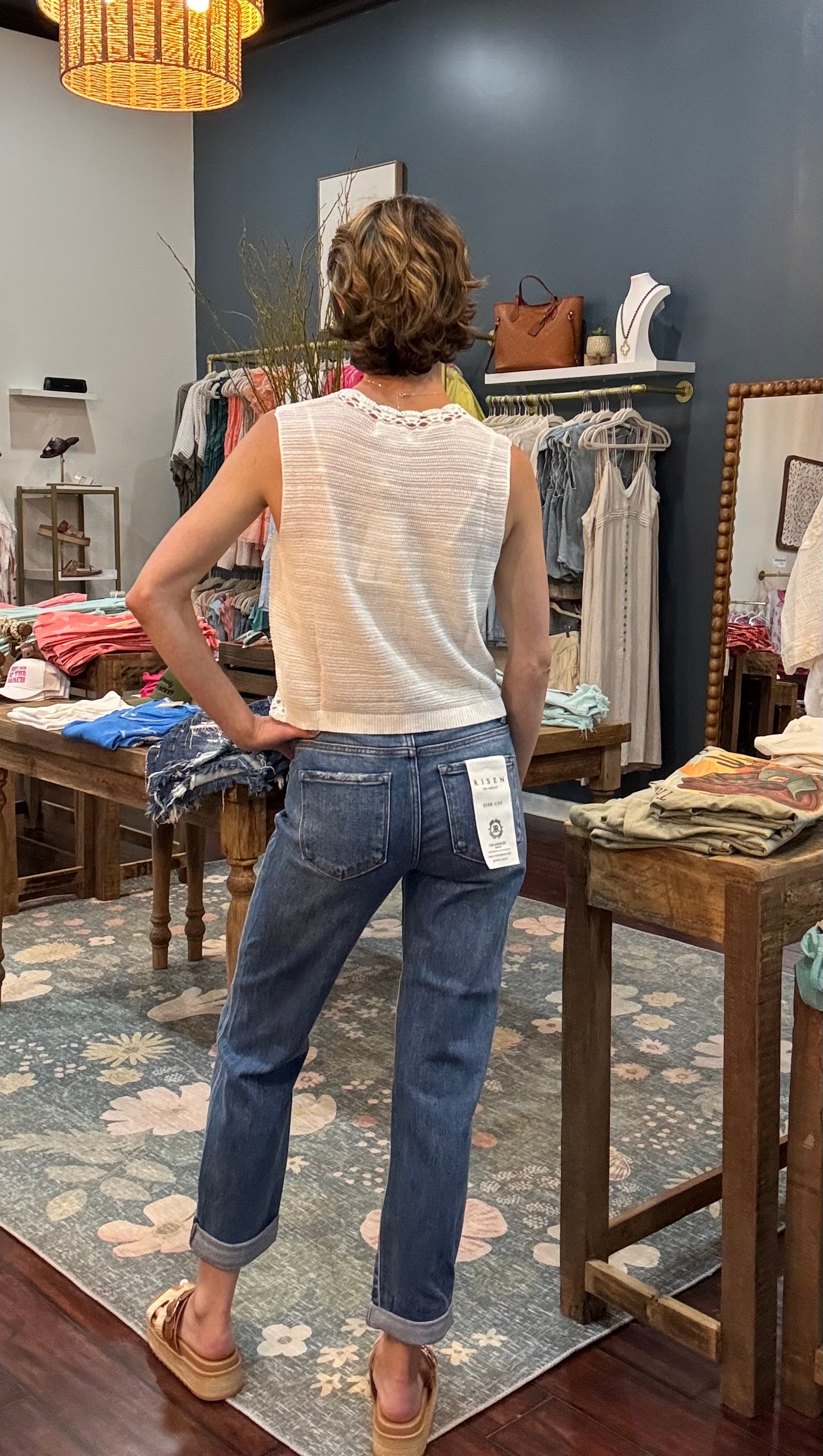 This top is a sleeveless, crochet-style button front vest in a soft cream color. Featuring a delicate scallop trim with V-neck. Functioning button down front. Relaxed, slightly loose fit.