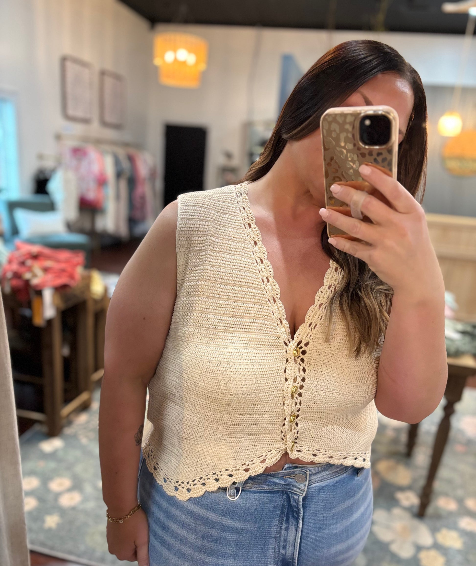 This top is a sleeveless, crochet-style button front vest in a soft cream color. Featuring a delicate scallop trim with V-neck. Functioning button down front. Relaxed, slightly loose fit.