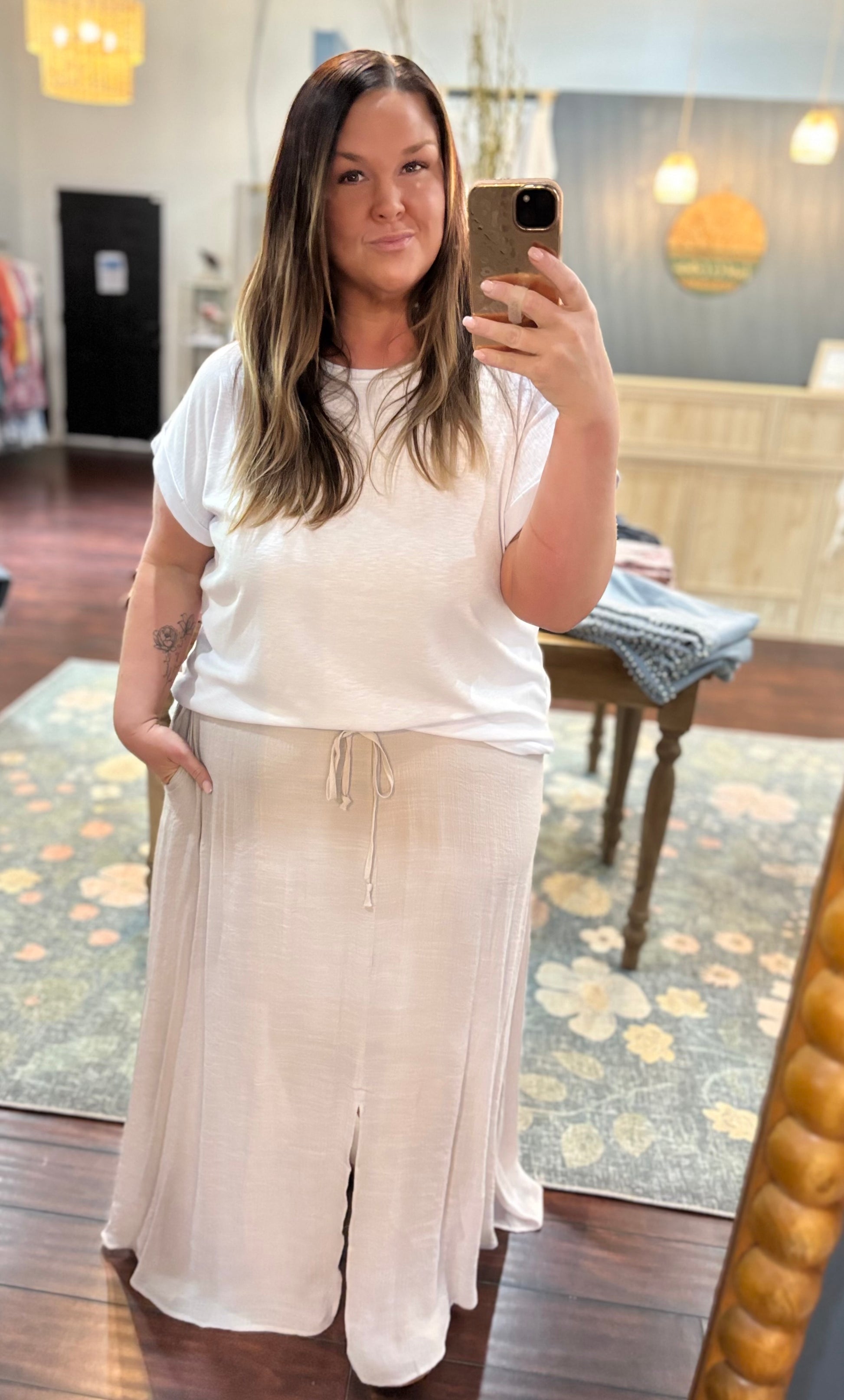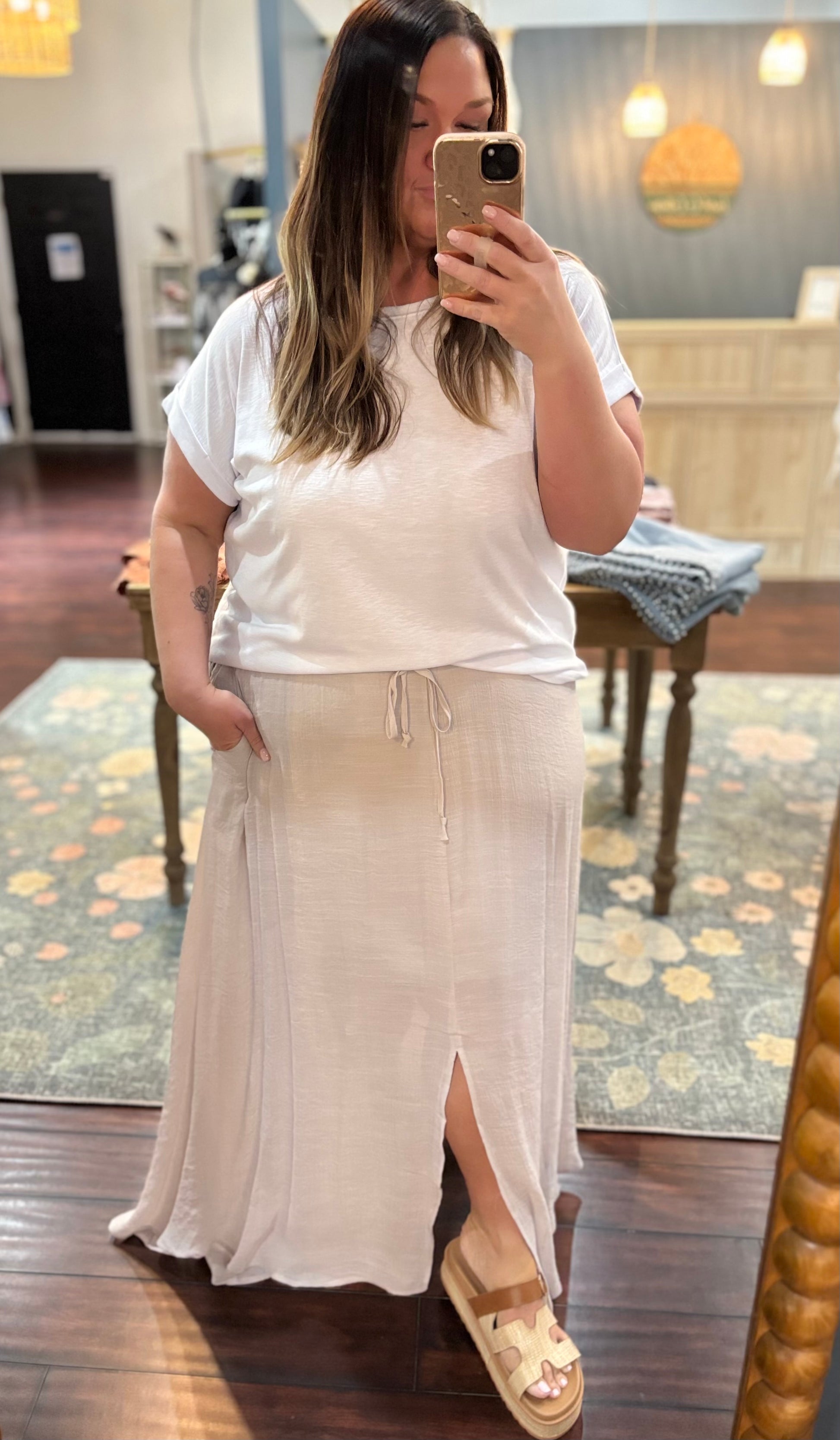 Perfect for summer with a plain white tee or for a transition piece into fall with a lightweight denim jacket. This skirt has an elastic waist band with drawstring and knee length inner lining. Also has side pockets.