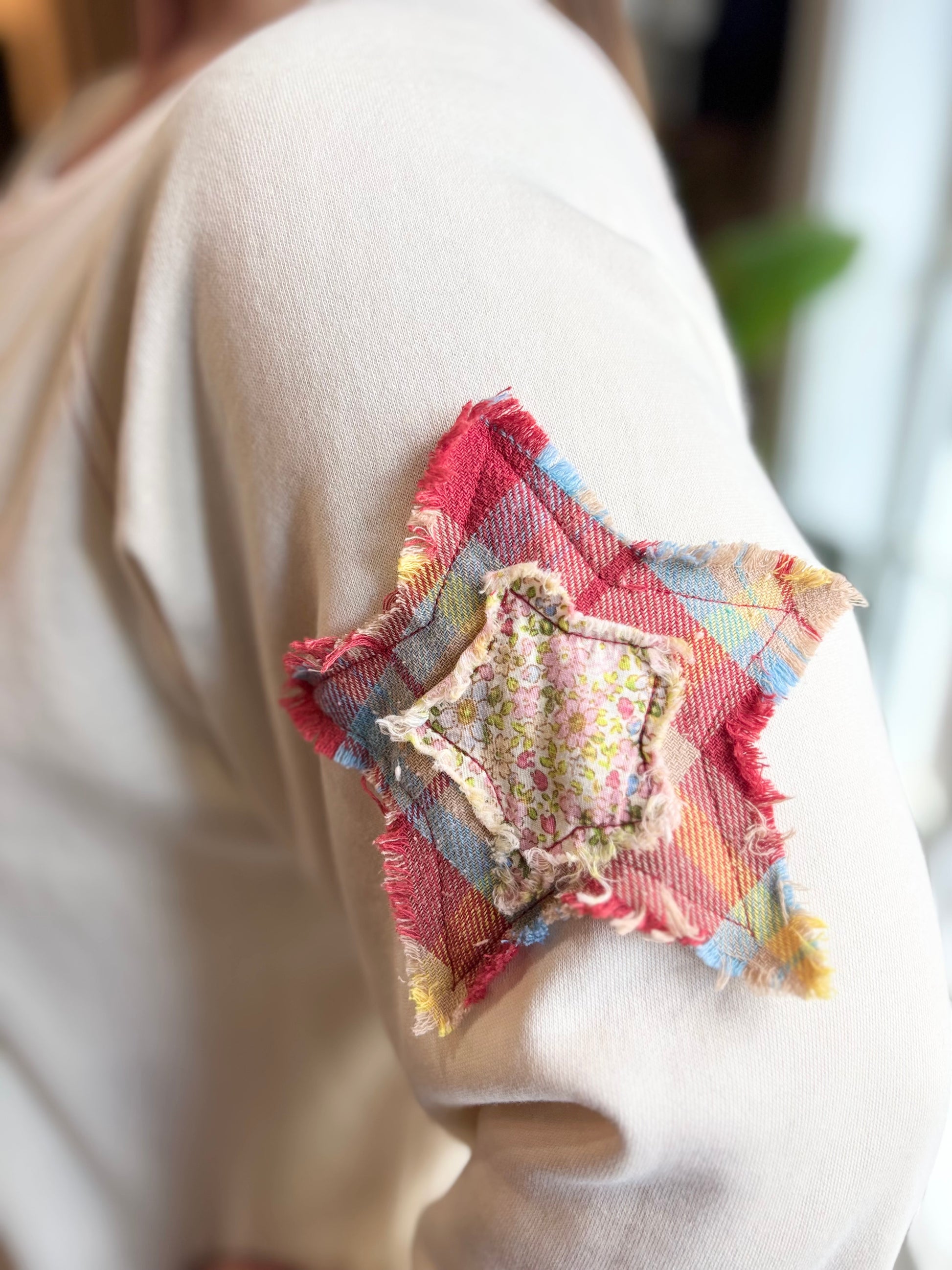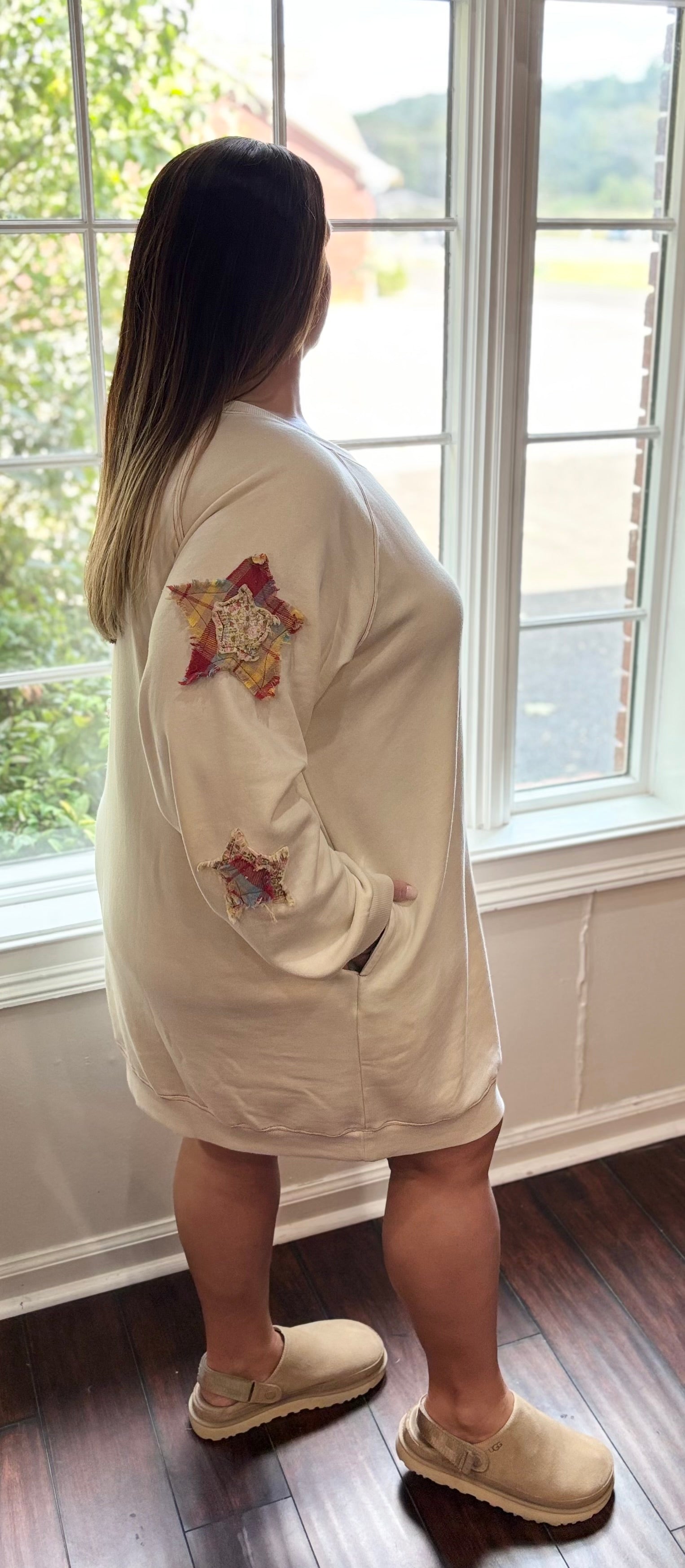 This ultra-soft sweatshirt dress brings all the cozy vibes with its relaxed, oversized fit and easy throw-on style. The creamy neutral fabric keeps it simple and chic, while the playful, multicolor star patches on the sleeves add that signature boho-rustic charm your closet has been missing.