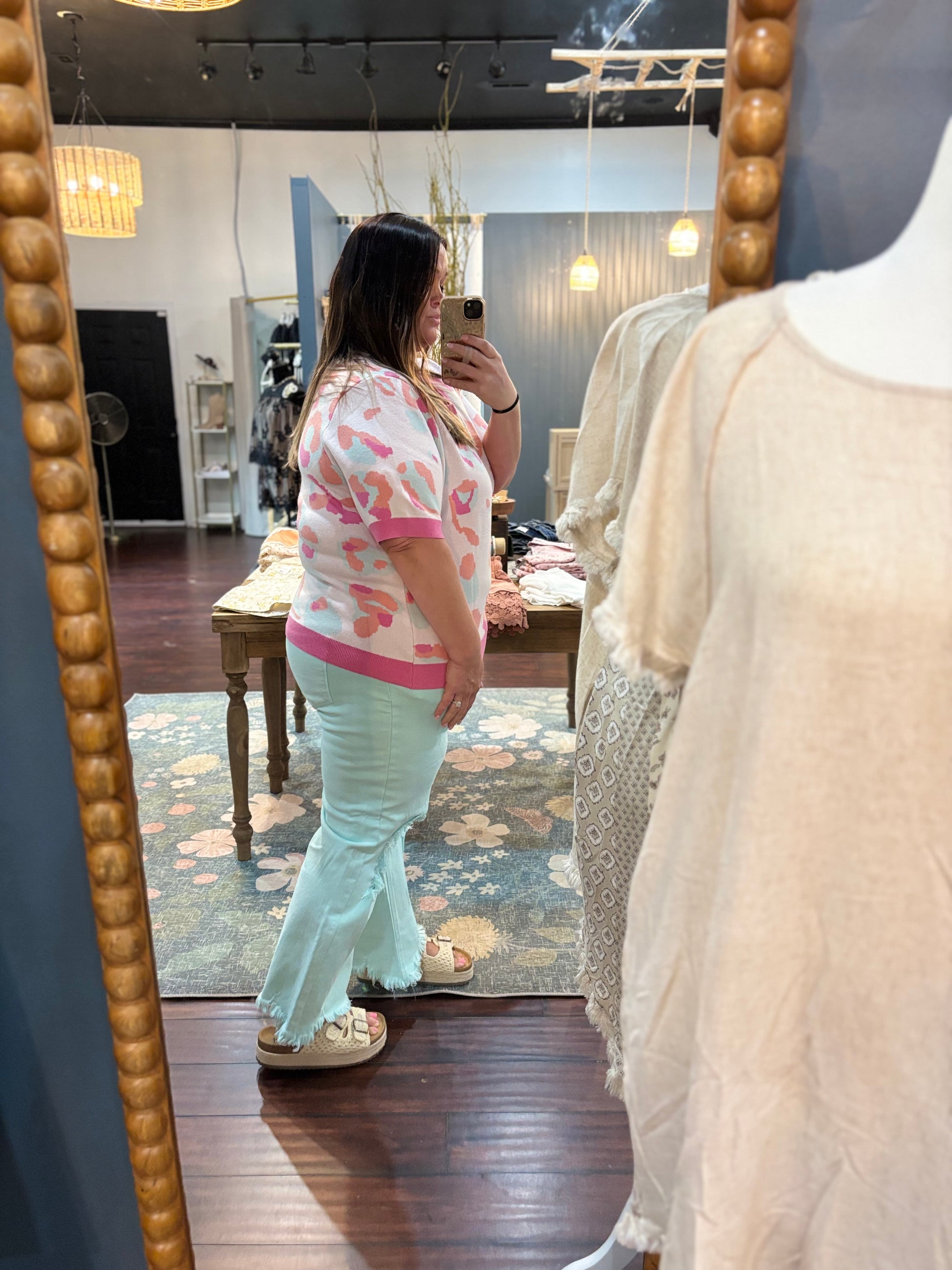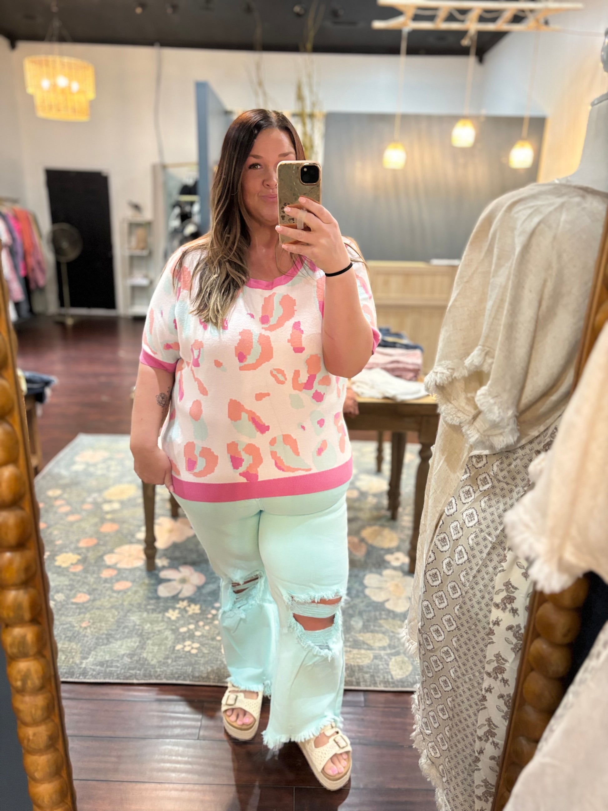 This top is a soft, lightweight knit featuring a playful leopard print in pastel tones of peach, blush pink, mint, and coral.