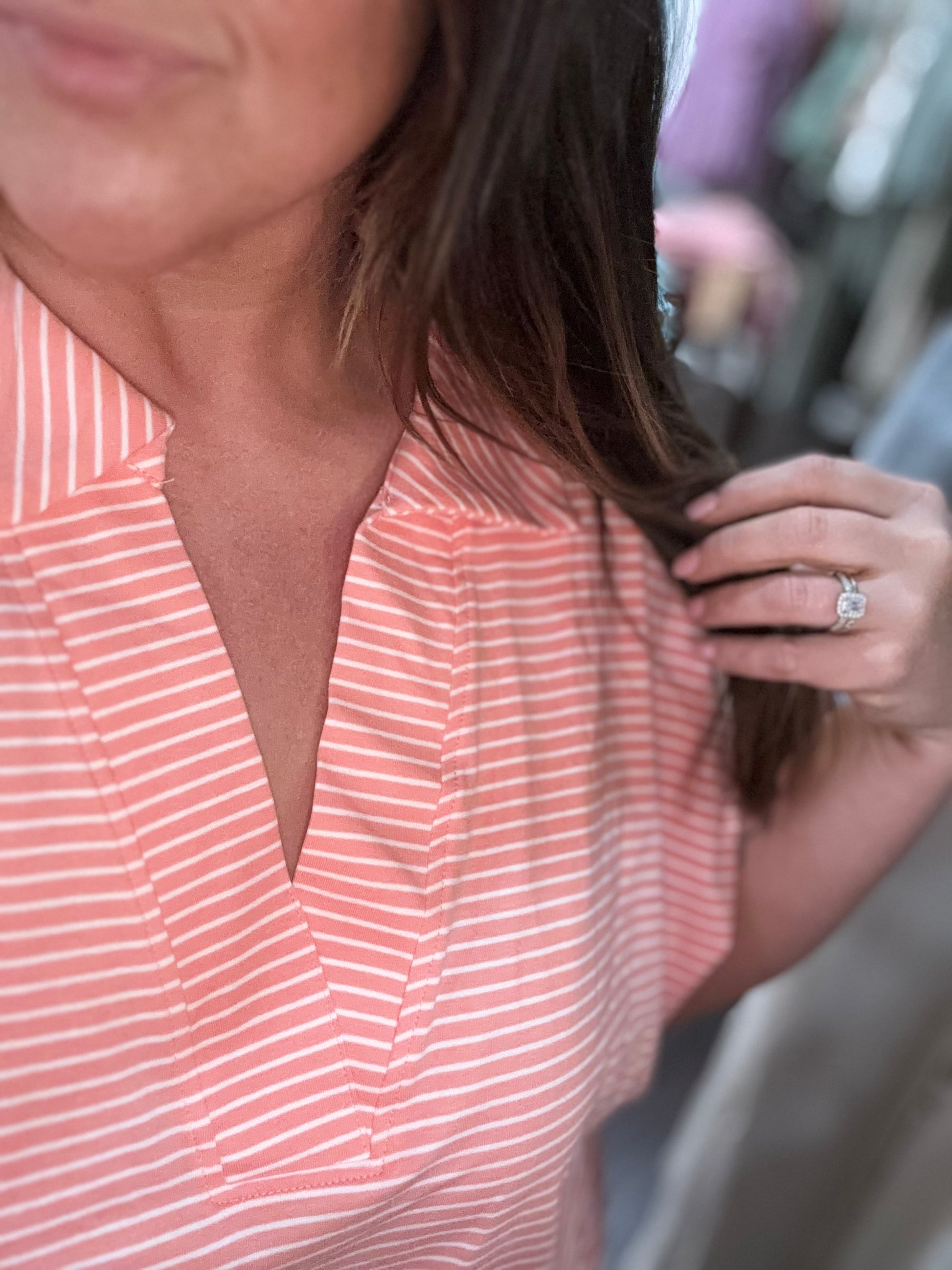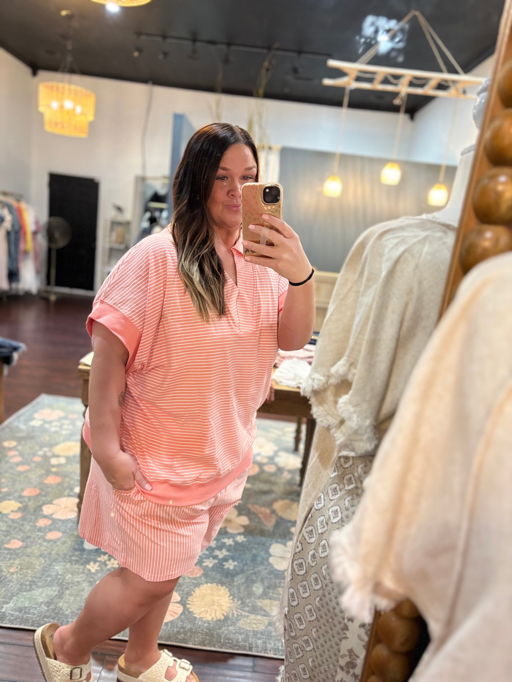 This cozy, casual set is a summer must! The bright peach and white stripe gives a great option for on-the-go errands or any casual outing.