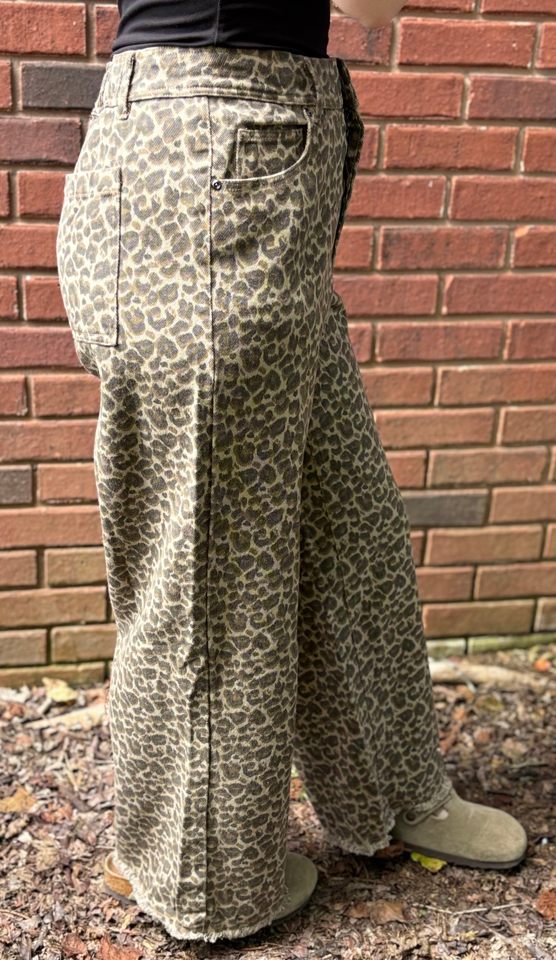 These pants are a bold twist on a classic wide-leg jean with a laidback, modern edge. Crafted in a sturdy denim-like fabric, they feature an all-over leopard print in muted neutral tones that make them easy to style while still standing out. The relaxed straight-leg silhouette gives them a comfortable, flattering fit, while the raw hem detail adds a touch of effortless, lived-in cool. Pair them with boots and a chunky sweater for a chic fall look, or dress them down with sneakers and a tee for everyday wear. These pants are the perfect mix of wild and wearable, making them a standout piece for your wardrobe.